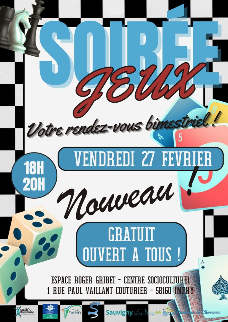 L’Espace Roger Gribet, centre socioculturel d’Imphy, lance un nouveau rendez-vous bimestriel dédié au jeu et à la convivialité : la Soirée Jeux, un moment ludique ouvert à tous et gratuit, organisé de 18h à 20h.